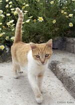 こちらの家の玄関前アプローチにもステキな小石のモザイクがありました。この猫は、最初、背中を下にして、ゴロンゴロンと寝転がっていました。肉球マッサージよりも、背中のツボ押しの方が気持ちよさそうです。