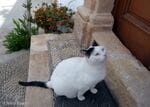 最初に出会ったマダムのレストランを見つけました。覗いてみると、とてもチャーミングな三毛猫が柱に体をこすりつけていました。「誰か遊んでくれないかなー」と、待ちかまえていたようでした。