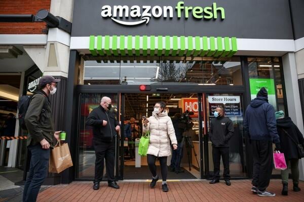 アマゾン・フレッシュ(写真は英国での実店舗=2021年3月4日撮影、写真:ロイター/アフロ)とハッピー・ベリーを統合して「アマゾン・グロサリー」PBを再構築した