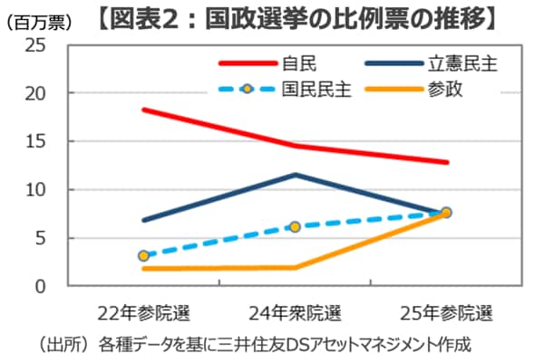 先日の参院選では、自公の連立与党が大きく議席を減らしましたが、野党第一党の立憲民主は自民から離れた票の受け皿となることができず、「手取りを増やす」ことを訴えた国民民主や、外国人政策の見直しを掲げる参政党が広く支持を集める結果となりました(図表2)。そう考えると、高市新政権がこうした新興政党の主張とシンクロする目玉政策を携えて解散総選挙に打って出るなら、新興政党に大量に流出した保守票が還流することで、自民党が党勢を盛り返すシナリオが現実味を増してきそうです。