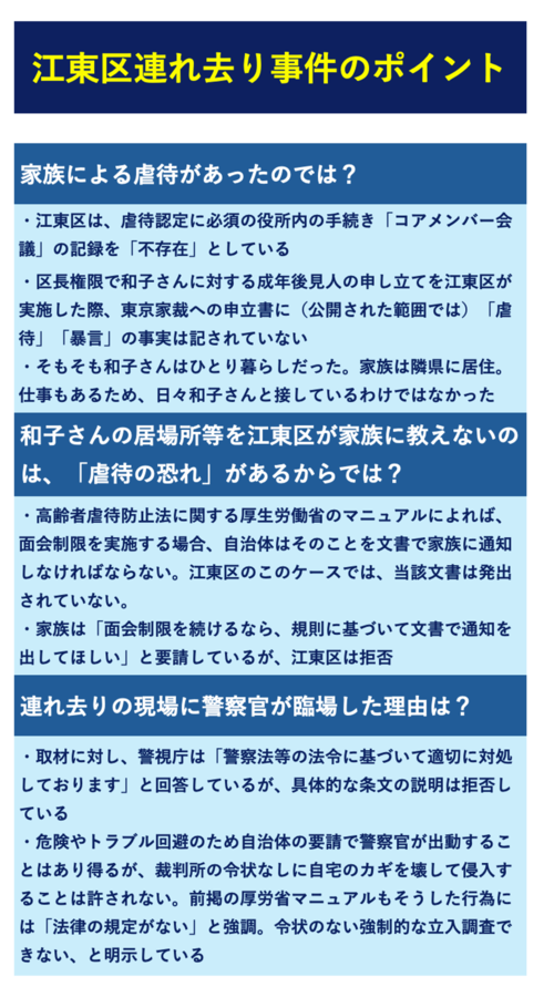 では、100歳近い和子さんは、なぜ、家族と引き離されたのか。江東区などの説明には多くの矛盾と疑問がある。取材をもとにそれらのポイントをまとめたのが次の図表だ。