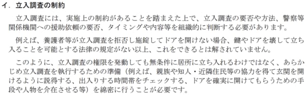 厚生労働省のマニュアルには、立ち入り調査で鍵を壊して住居に入ることについて、法律上は「できるとは解されていません」と明記されている(厚労省「市町村・都道府県における高齢者虐待への対応と養護者支援について」)