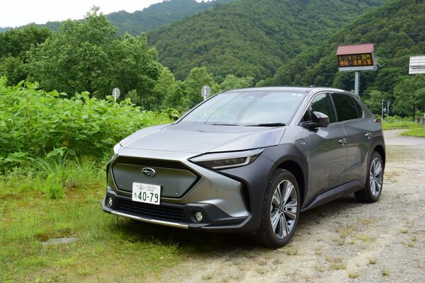改良前のスバル「ソルテラAWD」。トヨタbZ4Xと同型。公称487kmに対し、実績値は350km。ただしスタート地点からの標高差が900mほどあり、位置エネルギーを加味すれば390km程度になる(筆者撮影)