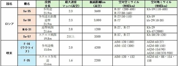 表 ロシアと欧米(ウクライナ)保有の戦闘機能力比較