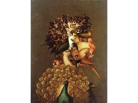 アルチンボルドは《大気》《火》《大地》《水》という連作「四大元素」を、それぞれにふさわしいモティーフで描きました。これらは「四季」の連作と同様に、皇帝の膨大なコレクションで培った博物学的な知識や、動物園、植物園などでの観察から、精緻な描写をしています。