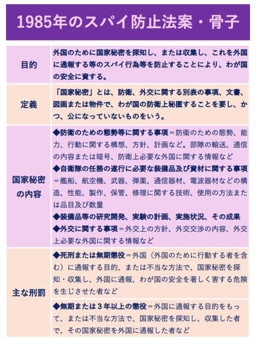 このように、自民党保守派や統一教会系団体の強いバックアップを受けつつ、スパイ防止法案は1985年に国会提出されました。その概要は下表の通りです。
