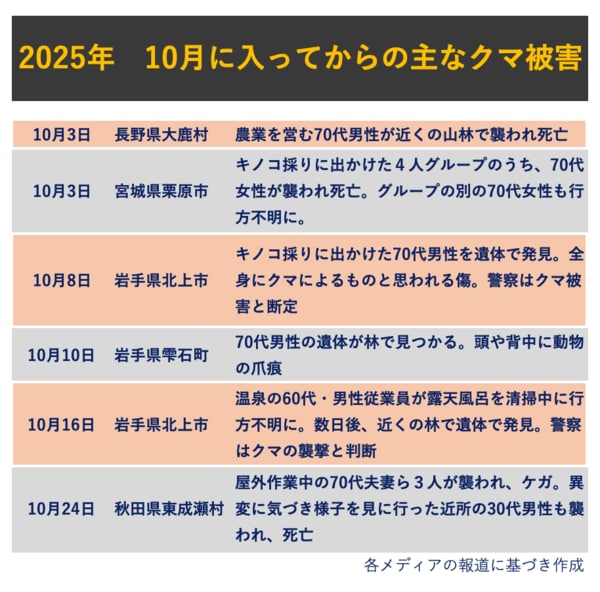 被害は10月に入ってさらに増えてきました。クマに襲われて死亡したと思われるケースをまとめると、下表のようになります。