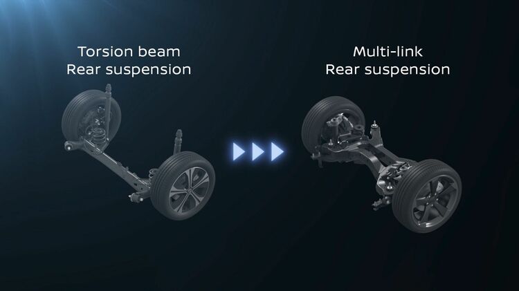 まずプラットフォームは「ひとクラス上」の日産アリアと同じCNF-EVプラットフォームを採用。おかげでリアサスペンションが半独立式のトーションビームから完全独立式のマルチリンク式へと大幅に格上げされた。