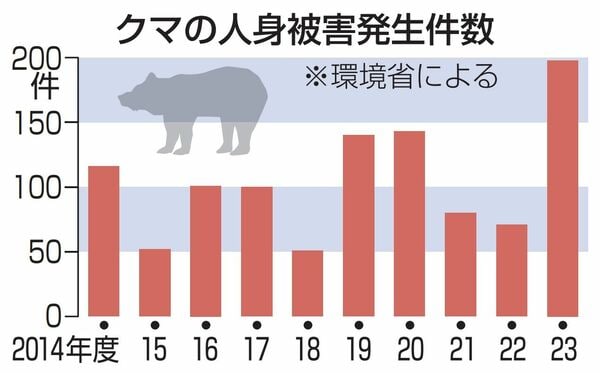 クマによる人身被害も増加中だ。令和5年度は198件(219人、死亡6人)で、統計のある平成18年度以降で過去最多。9月以降に顕著に増加し、10月の発生件数は過去最多だった。令和6年度は4月、5月の2カ月間で13件(15人)となっている。