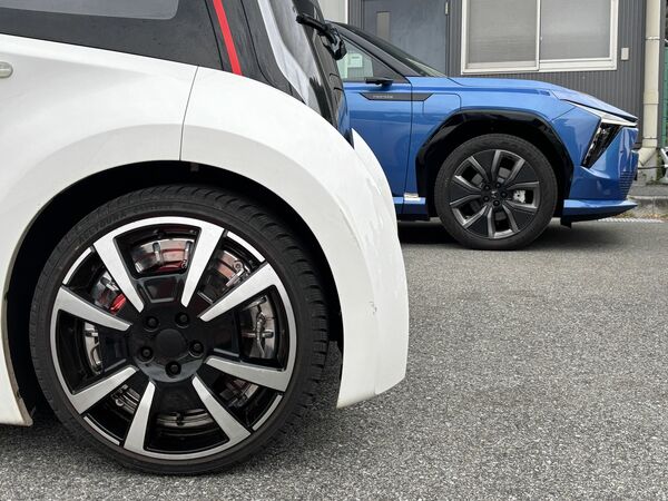 「V03」(手前)のホイール内に、インホイールモーターが見える(写真:筆者撮影)