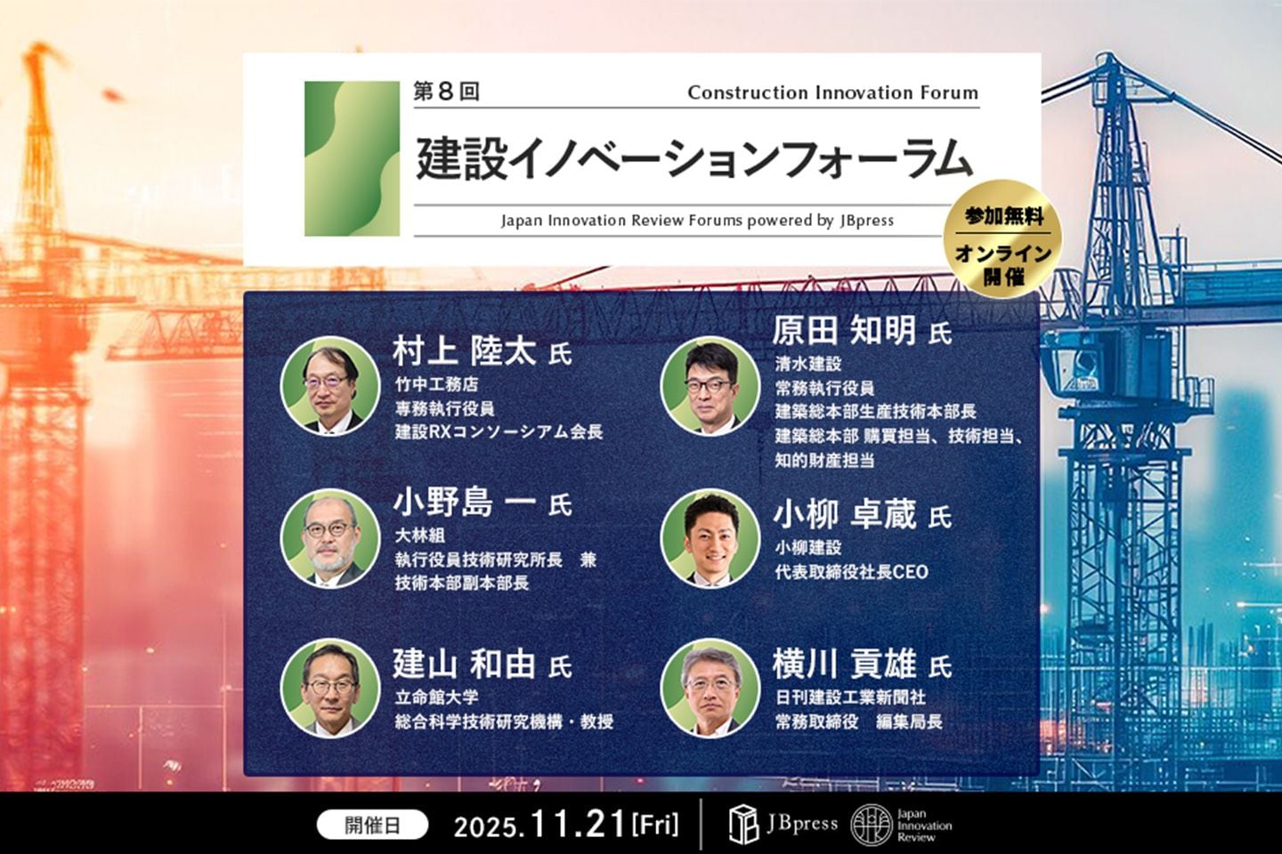 JBpress/Japan Innovation Reviewでは11月21日(金)に「第8回 建設イノベーションフォーラム」を開催します。本セミナーでは、竹中工務店 専務執行役員 村上陸太氏(建設RXコンソーシアム会長)、清水建設 常務執行役員 原田知明氏、大林組 執行役員 小野島一氏、日刊建設工業新聞社 編集局長 横川貢雄氏が登壇し、「建設業変革の次章-技術共創から社会実装へ、業界全体の最適化をめざして」をテーマに議論します。基調講演では、立命館大学 総合科学技術研究機構 教授の建山和由氏が、ロボットや建設機械の自動化・遠隔操作による省人化、生成AIやデジタルツインを活用した技能継承と施工管理の高度化、BIM/CIMによるプロセス革新、デジタル人材の育成まで、建設業の持続的成長を実現するための戦略と実践を多角的に解説します。このほか、建設DXで地方創生をめざす小柳建設 小柳卓蔵社長による講演など、建設業必見のプログラムが満載です。ぜひご参加ください。