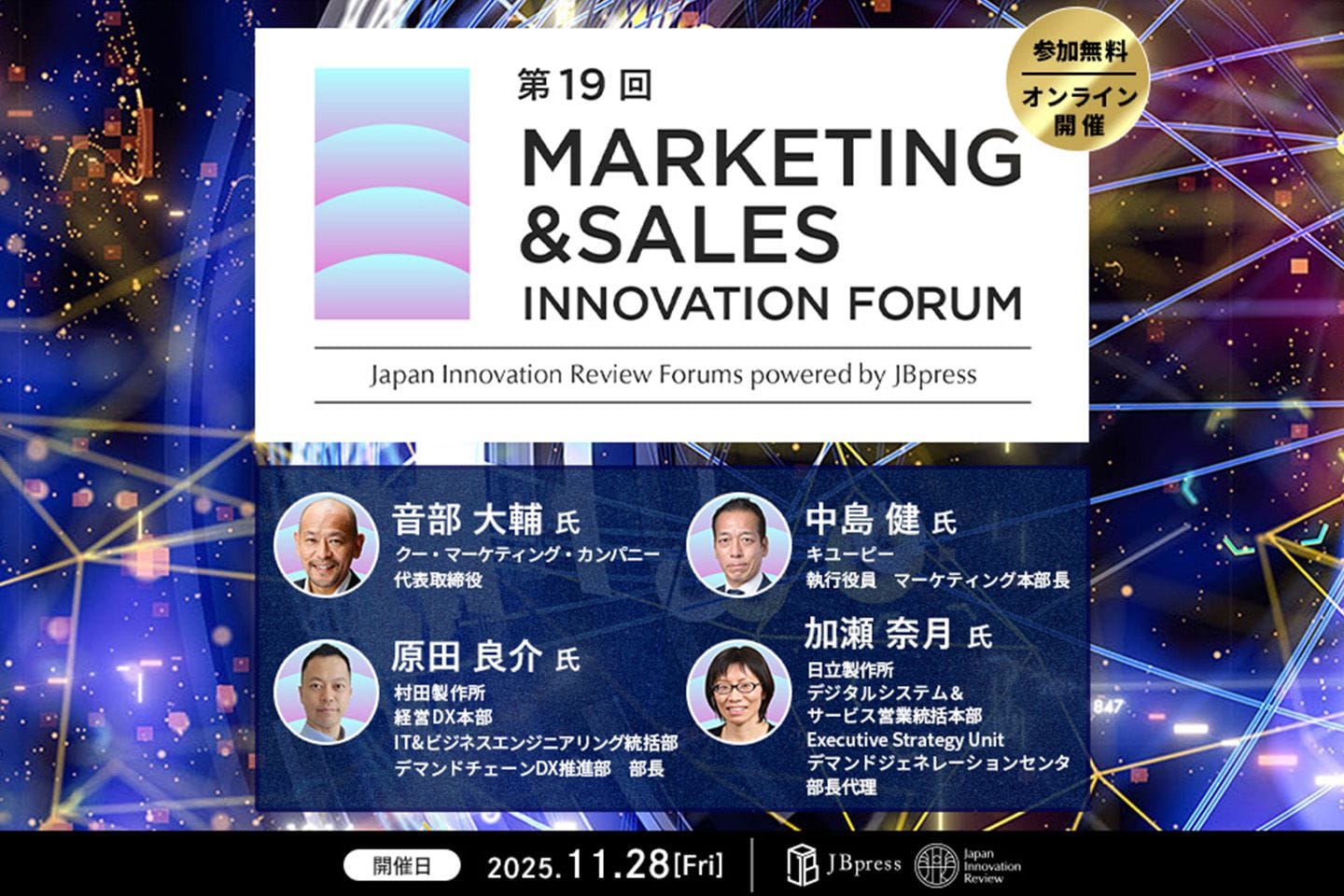 JBpress/Japan Innovation Reviewでは、11月28日(金)に「第19回 マーケティング&セールスイノベーションフォーラム」を開催します。本フォーラムでは、日立製作所 デジタルシステム&サービス営業統括本部の加瀬奈月氏が「営業活動におけるデジタルマーケティング導入の取り組み」を紹介。村田製作所 IT&ビジネスエンジニアリング統括部の原田良介氏は、「AI変革期における電子部品ビジネスの課題と戦略」を語ります。さらに、キユーピー 執行役員 マーケティング本部長の中島健氏が「データでつなぐ“全社最適化”――組織とマーケティングのDX戦略」を解説。生成AI時代におけるマーケティング&セールスの進化と新たな競争優位のつくり方を、実務の最前線から学べる貴重な機会です。ぜひご参加ください。