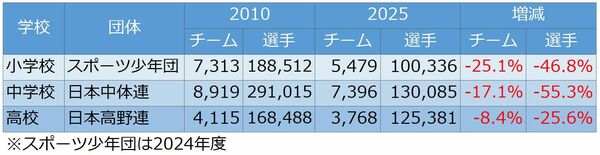 主要な野球団体が発表した、2010年と2025年(小学校[スポーツ少年団]は24年)の小学校、中学校、高等学校のチーム数、男子選手数を比較してみよう。