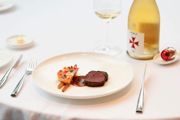 ヴィンテージとノーブル・シャンパーニュには、エゾジカのロティとメークインのコンフィ、野菜のタルトが用意された。ヴィンテージには、ちょっとコショウのようなニュアンスがあるので、こういうジビエ料理に対してはスパイス的な役を演じられる