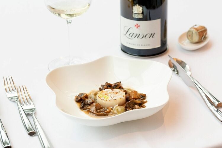 フィリップ・ミル シェフがブラン・ド・ブランと合わせたのはグリルした帆立貝に様々なキノコとキノコのラヴィオリを組み合わせた料理。これが落ち着いた紳士から、強烈な旨味を引き出した。ブラン・ド・ブランに限らず、酸味が強いランソンのシャンパーニュはちょっとした塩味との組み合わせで化ける
