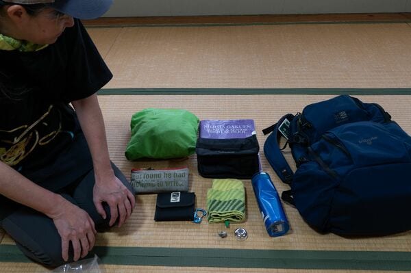 涼太さんの事故当日の持ち物。リュックサックは同じ色、サイズのものを黒崎さんが後に買い直した(2025年9月29日穐吉撮影)