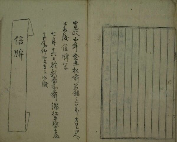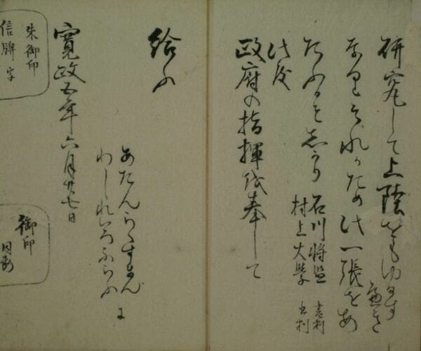 方針を決めた定信は、目付の石川忠房と村上大学を「宣諭使(せんゆし)」に任命。蝦夷地に派遣し、松前の地でラクスマン側と交渉を行った。その結果、漂流者2名を引き取り、「おろしや国の船壱艘長崎に至るためのしるしの事」と題した長崎への入港許可証(信牌)を、ラクスマンに交付している。