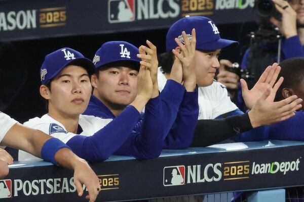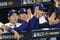 10月17日、ブルワーズとのナ・リーグ優勝決定シリーズ第4戦、9回裏をダッグアウトから見守るドジャースのキム・ヘソン、山本由伸、大谷翔平(写真:Imagn/ロイター/アフロ)