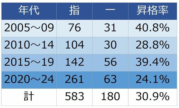 育成選手は昇格までに数年の時間を要する。20年~24年の昇格率が低いのは、今後昇格するであろう選手が含まれていないからだ。