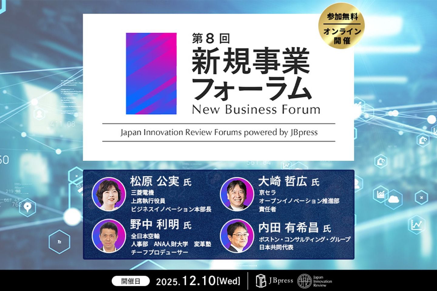 JBpress/Japan Innovation Reviewでは12月10日(水)に「第8回 新規事業フォーラム」を開催します。本セミナーでは、三菱電機 上席執行役員 ビジネスイノベーション本部長の松原公実氏が、リスクを恐れず新たな発想で価値を創出するイノベーティブカンパニーへの変革に向けた取り組みについて講演します。また京セラ オープンイノベーション推進部 責任者の大崎哲広氏が「横の連携」で模索する同社のオープンイノベーションの活動の実例を紹介。さらにANA人財大学 変革塾 チーフプロデューサーの野中利明氏が、二刀流人財を輩出するための新規事業提案制度「がっつり広場」について講演します。基調講演では、『新規事業撤退力を高める』の著者であるボストン・コンサルティング・グループ 日本共同代表の内田有希昌氏が登壇。「良い着工」と「良い撤退」ができる、新規事業に強い体質づくりへのヒントを提示します。新規事業を成功へ導くための組織づくりとマインドセット、そしてテクノロジーを軸とした戦略的実践について、先進企業の事例を交えて探ります。ぜひご参加ください。
