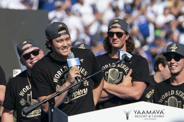 最近は、日本に距離的にも近く気候の温暖な西海岸が移籍先として人気に。写真はドジャース優勝セレモニーの大谷翔平選手(写真:ZUMA Press/アフロ)