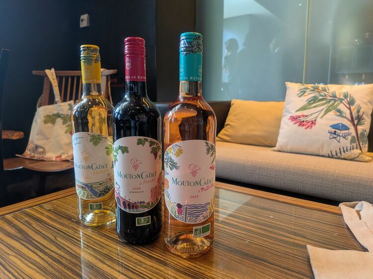 右がもっともおなじみの「ムートン・カデ・ルージュ」(1,925円)左が厳選した3生産者のブドウ(基本はメルロー)を使う「ムートン・カデ・キュヴェ・ヘリテージ・ルージュ」(2,640円)中央は「ムートン・カデ・ソーヴィニヨン・ブラン・オーガニック・バイ・ナタン」(2,200円)