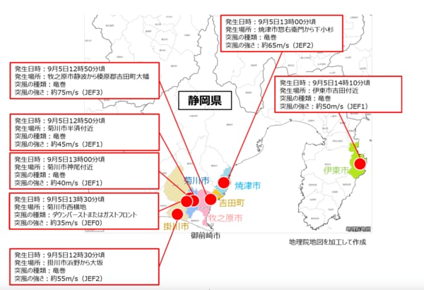 今年(2025年)9月5日の正午過ぎ、静岡県内各地で相次いで突風が吹き荒れました。気象庁は、そのうち6つの事象について、竜巻が発生したと発表しました(図表1)。