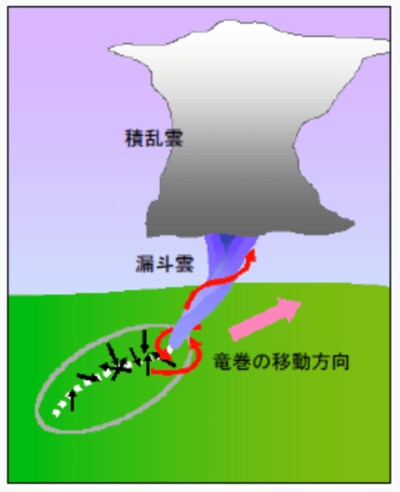 実際に竜巻が発生する過程にはさまざまなパターンがあります、しかし、風の渦の起原についていえば、大きく分けて、①積乱雲の中で竜巻の種ができる場合と、②地表近くで竜巻の種ができる場合の2通りがあります。