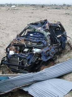 津波によって押しつぶされた自動車。仙台市宮城野区にて(参考写真)