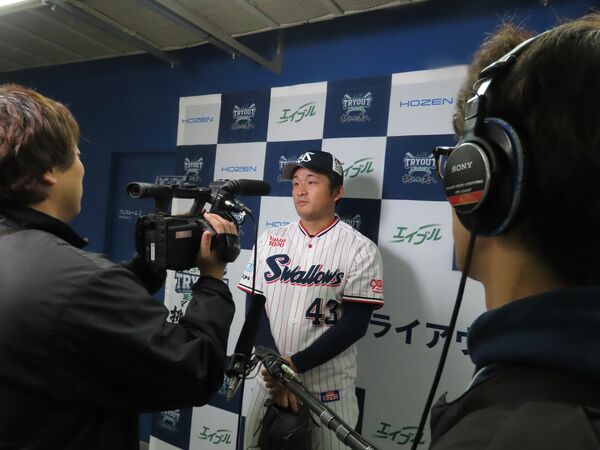 ミックスルームでインタビューを受けるヤクルト山本大貴(筆者撮影)