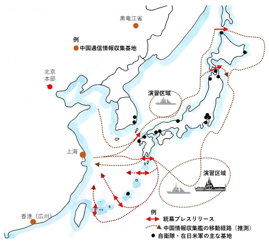 海軍情報収集艦や情報収集機は、日本と中国の中間線を越え、日本の領空・領海まで接近、時には領海に侵入し、情報を収集している。