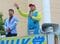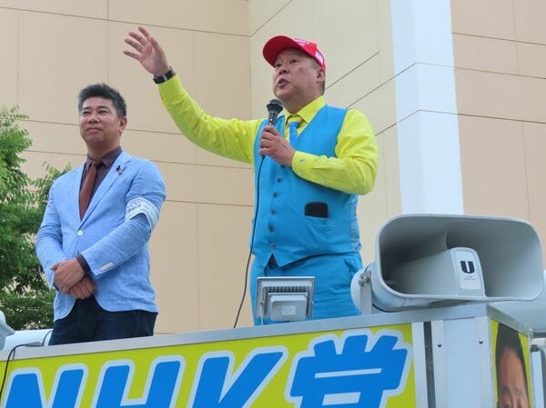 逮捕された立花孝志容疑者(右)。写真は今年7月の参院選で街頭演説した際のもの。左は斉藤健一郎参院議員=神戸市中央区