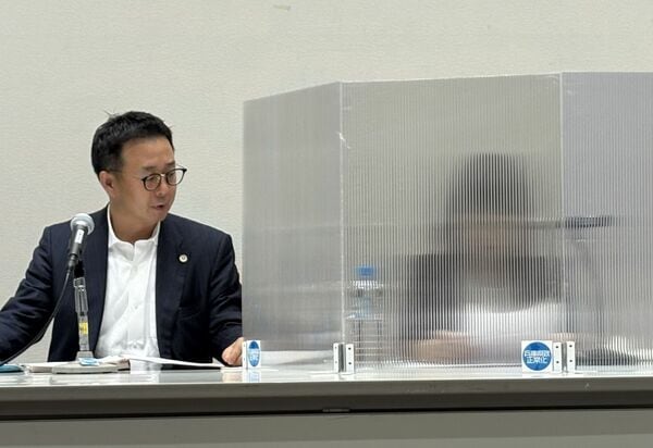 記者会見する竹内元県議の妻(右)と石森弁護士=8月8日、神戸市内