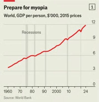 ところが、2022年から2024年にかけて世界全体の実質国内総生産(GDP)は平均で年率3%の成長を遂げた。今年も同じく3%の成長をひねり出す見通しだ。