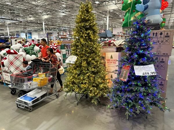 コストコホールセールのクリスマス用品売り場。中央のクリスマスツリーには10万円以上の値札がついている(10月14日デンバーで、写真:AP/アフロ)