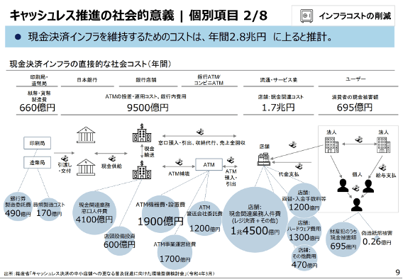 経済産業省の試算によれば、現金決済インフラを維持するためのコストは年間2.8兆円に上るとのことで、これはおおむね消費税1%分に相当します。このような実際の費用として生じる金額だけではなく、決済にかかる時間やわずらわしさを軽減できると思えば、キャッシュレス化の進展による実際の効用はさらに高い価値を持つものと考えられます。