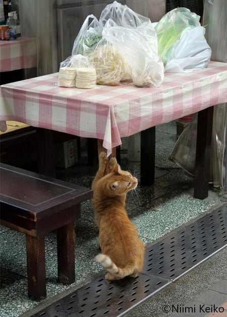 住宅地のほぼ中心に市場があり、青果店、鮮魚店、精肉店などの個人商店が所狭しと並んでいます。その一角にテーブルが2つだけの小さな食堂がありました。下ごしらえをする主人を応援する猫。長年にわたる応援の爪研ぎで、テーブルの足が1本だけ、すっかり塗装がはげていました。