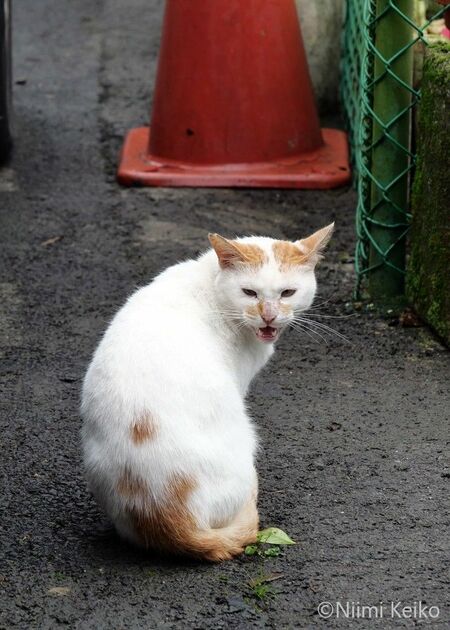 「道が濡れているから、滑らないように気をつけてね」と、注意してくれた猫です。このあたりの道はデコボコしていて、たしかに雨上がりは注意が必要です。