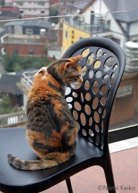 バルコニーへ出ると、そこにも猫がいました。背中を撫でてほしそうです。「きれいなミケちゃん」。そう言いながら背中を撫でてあげました。