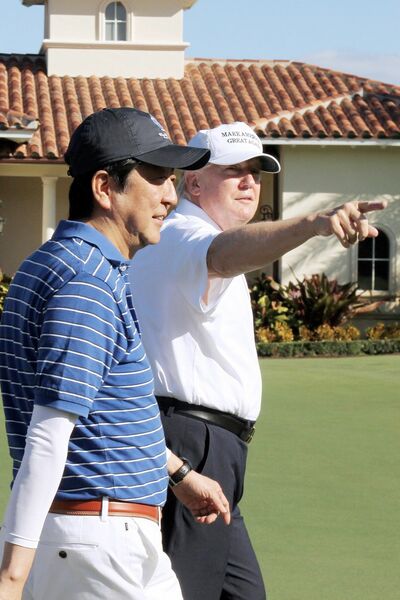 2017年2月11日、首脳会談翌日にゴルフを楽しむ安倍元首相とトランプ大統領(写真:ZUMA Press/アフロ)