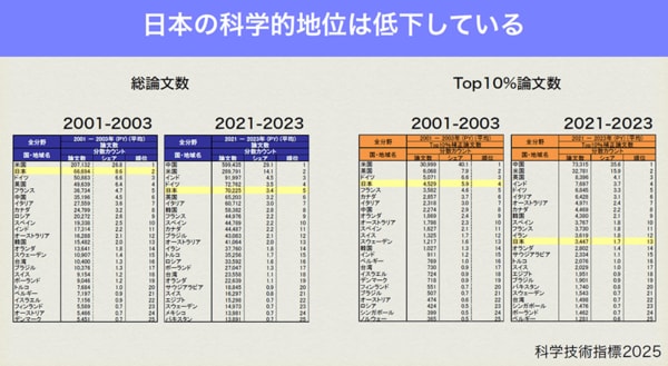2001〜2003年、日本は科学総論文数で米国に次ぐ世界2位を誇り、科学立国としての存在感は圧倒的だった。しかし、それから20年後の2021〜2023年には世界5位に後退した。