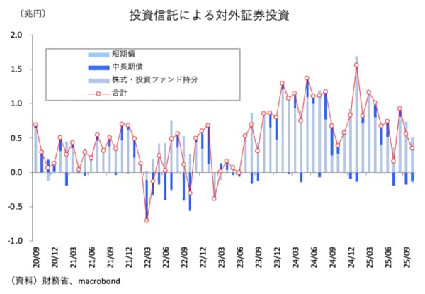 11月11日に財務省から公表された10月分の「対外及び対内証券売買契約等の状況(指定報告機関ベース)」によれば、「家計の円売り」の代理変数として注目される投資信託委託会社(以下投信)経由の対外証券投資は+3479億円と今年2番目に小さな買い越し額にとどまった。