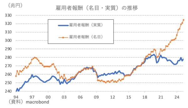実質ベースで雇用者報酬が伸び悩み、これと足並みを揃えるように個人消費も伸び悩んでいる。その状況下、資産運用に回す原資が潤沢に増え続けるという道理はない(図表③)。