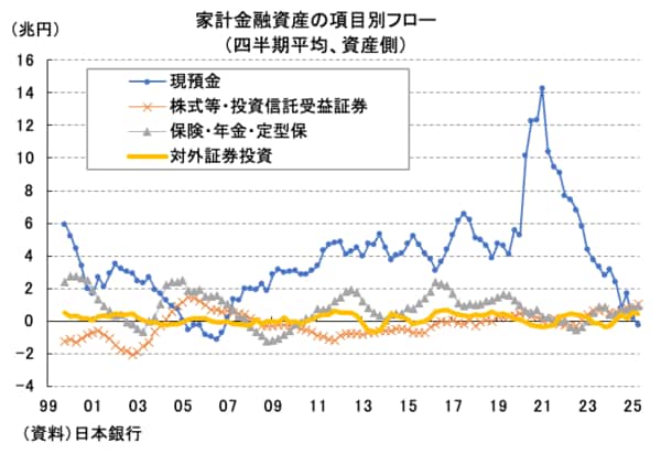 ただ、現在に目をやると、国内外株式への投資意欲が減退しているだけでなく、現預金も2022年以降で顕著に家計金融資産から減っている(図表④)。現状は「NISA貧乏(投資のせいで消費されない)」と揶揄されていた頃よりも芳しくない。