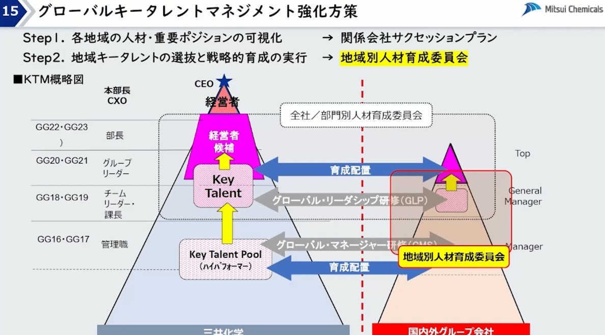 これまで実施してきたグローバル人材育成施策の概念を図にするとこのようになります(図1)。左側の三角形が三井化学本体の経営層を育成するためのピラミッド、右側が関係会社のリーダーシップポジションの人材を育成するためのピラミッドです。