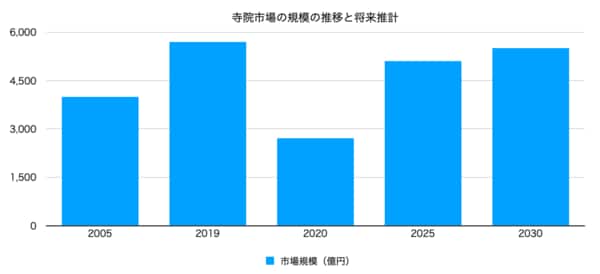 このたび、改めて最新のデータを使って算出したところ、寺院の総収入(市場)は推定で5000億円を上回る規模(2025年推計で約5100億円)と、コロナ禍前の水準に近づいていることがわかった。ただし、寺院経営の厳しさは変わらない。