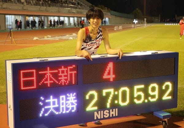 鈴木のタイムは27分05秒92。2023年12月に塩尻和也(富士通)が樹立した日本記録を3秒88更新した。駒大・大八木弘明総監督が「日本新。よく頑張った」と教え子の肩を叩くと、鈴木も「しっかり準備してきたので、それを出せたかなと思います」と笑顔が弾けた。