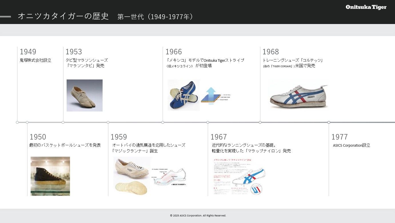 庄田良二氏(以下敬称略) 1949年に創業者の鬼塚喜八郎が会社を興し、3社合併によって77年にアシックスが設立されるまでの期間を、オニツカタイガーの「第1世代」と呼んでいます。アシックスの誕生と同時に、オニツカタイガーというブランドは休止となりました。