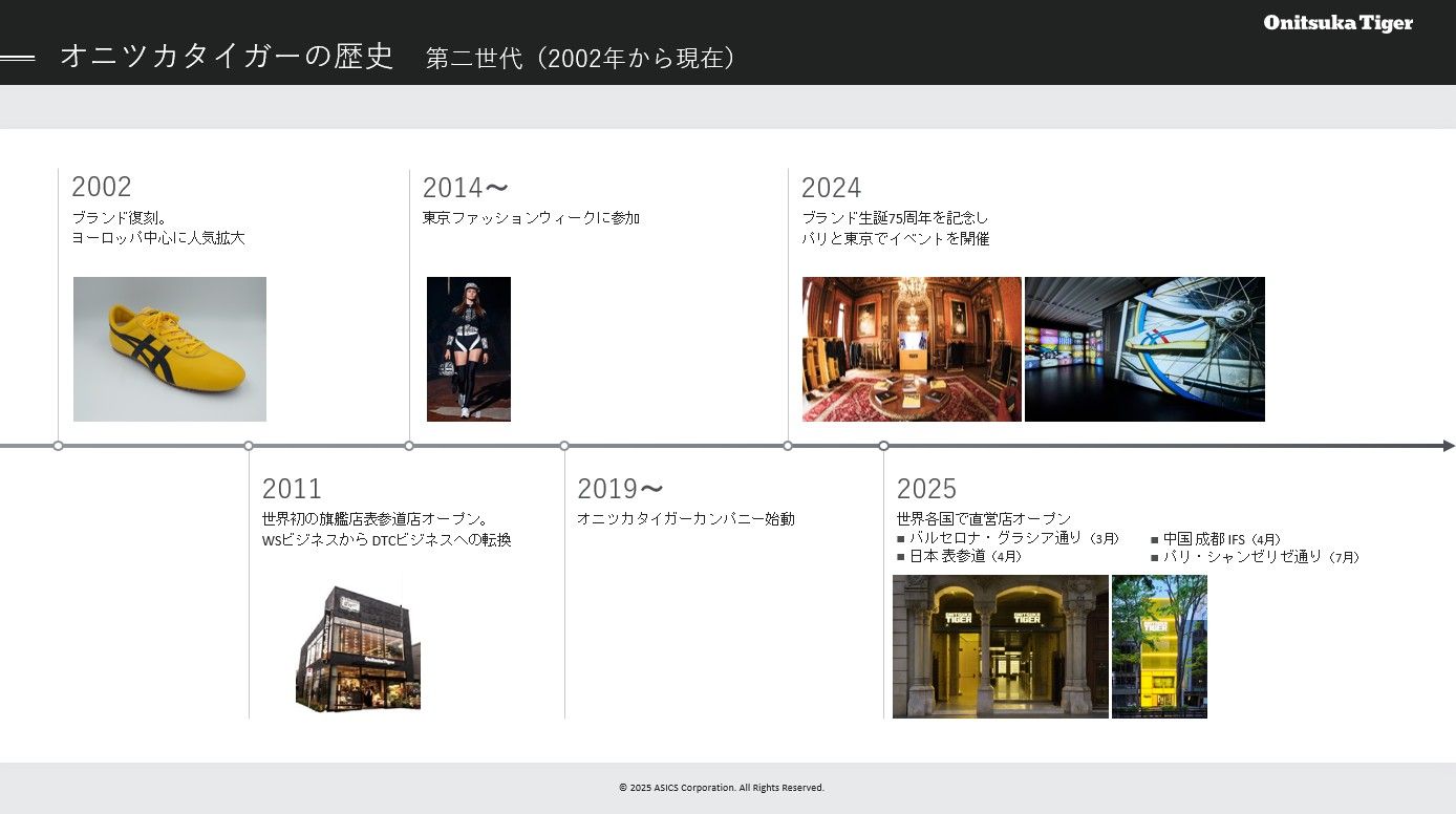 そして、2002年から現在までを、われわれはオニツカタイガーの「第2世代」と位置付けています。復刻後はヨーロッパを中心にブランドの人気が再び高まりましたが、鬼塚喜八郎が亡くなった07年以降、ブランドは再び岐路に立つことになりました。