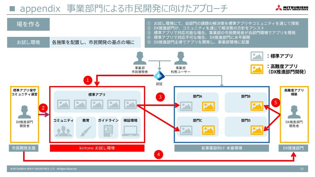 三菱重工業では、事業部門が自分たちで業務効率化につながるキントーンアプリを作り、自ら使うことを「セルフ開発(市民開発)」と定義し、その実践の場として独自の「キントーンお試し環境」を用意している。まずその環境で試行し、価値が確認できれば本番ドメインを立ち上げ、本番運用に進む。各段階で関係部門間の合意を取りながら開発を進める仕組みだ。